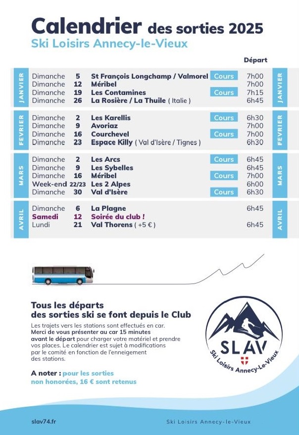 Merci de se présenter au car 15 minutes avant le départ pour charger votre matériel et prendre vos places.