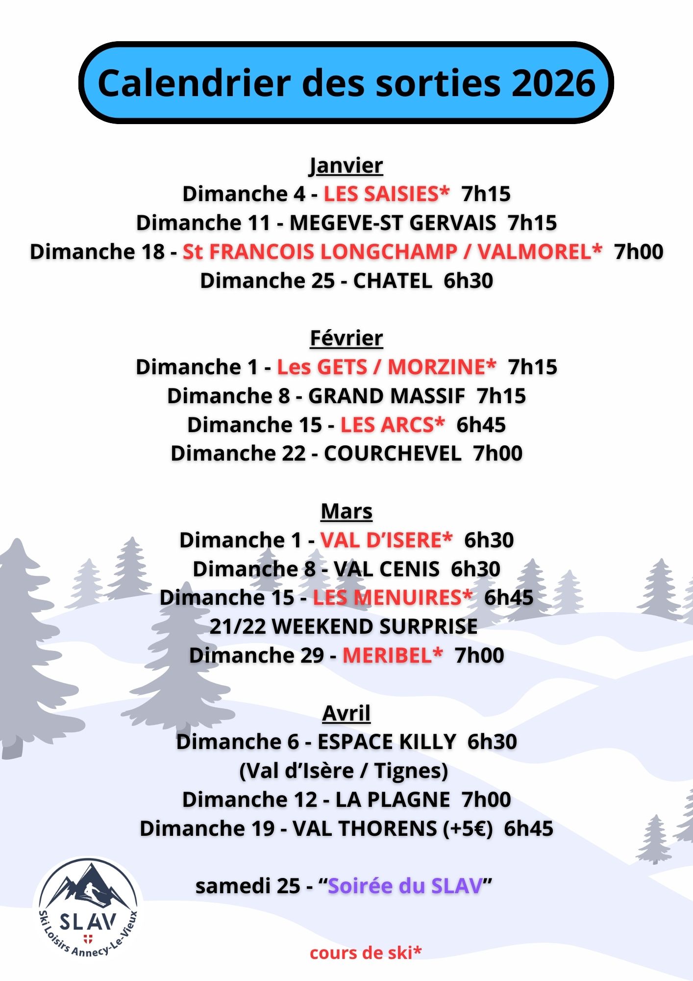 Merci de se présenter au car 15 minutes avant le départ pour charger votre matériel et prendre vos places.